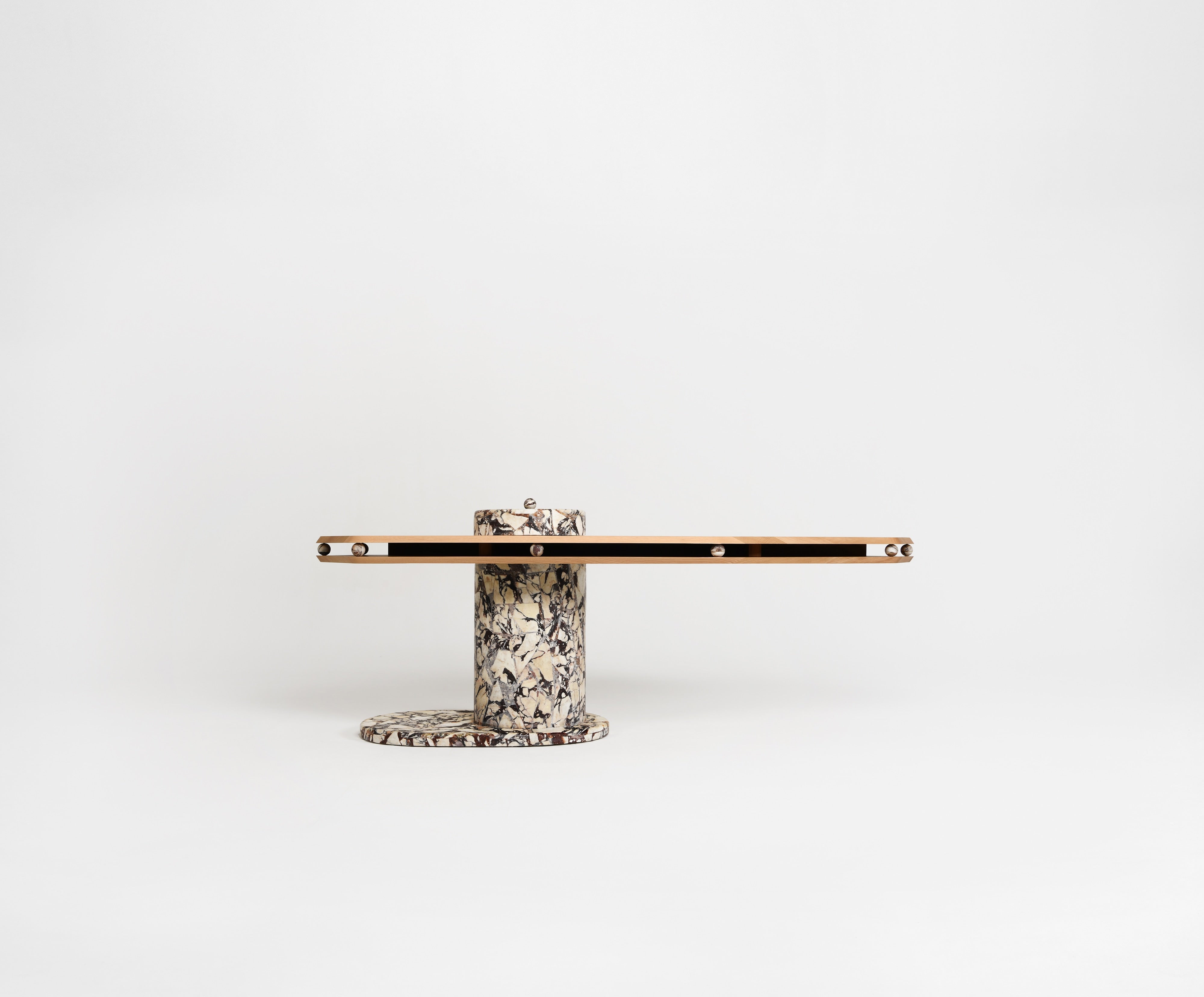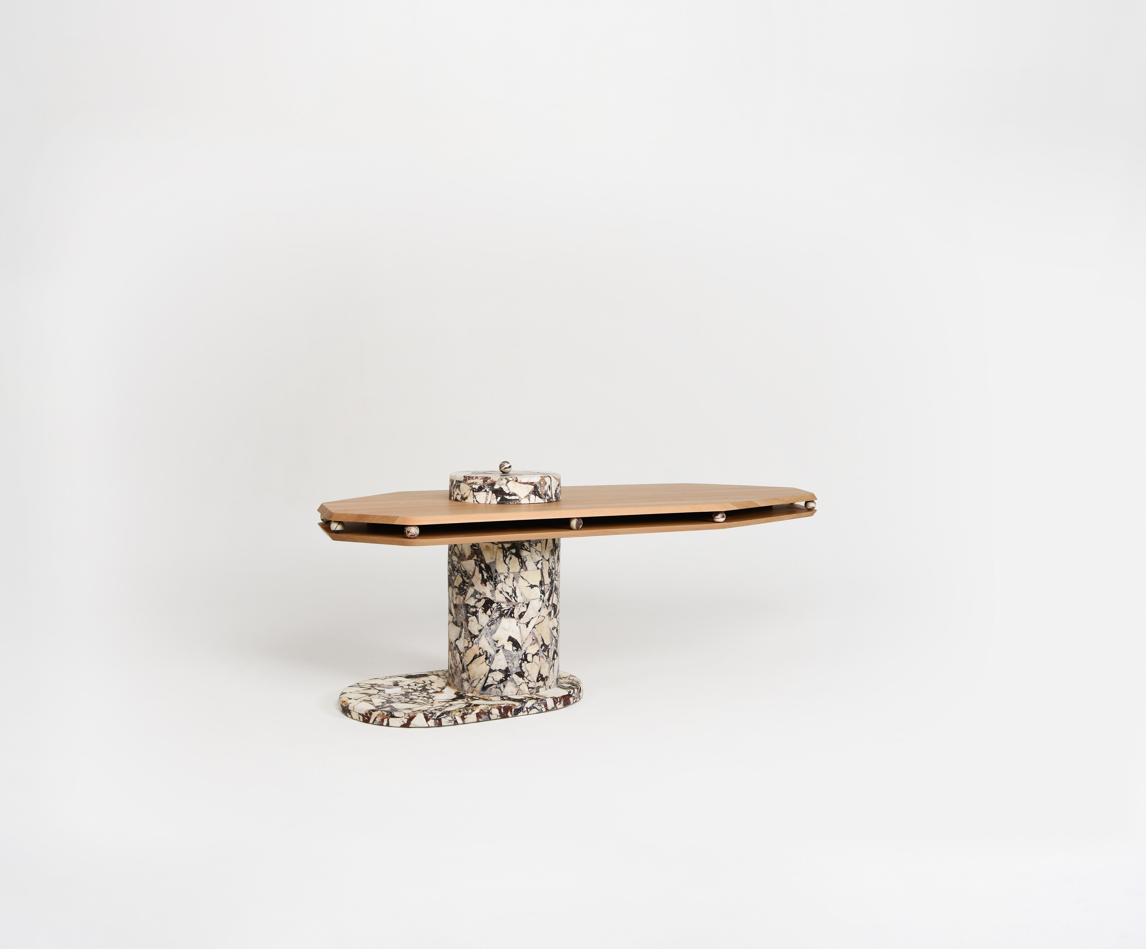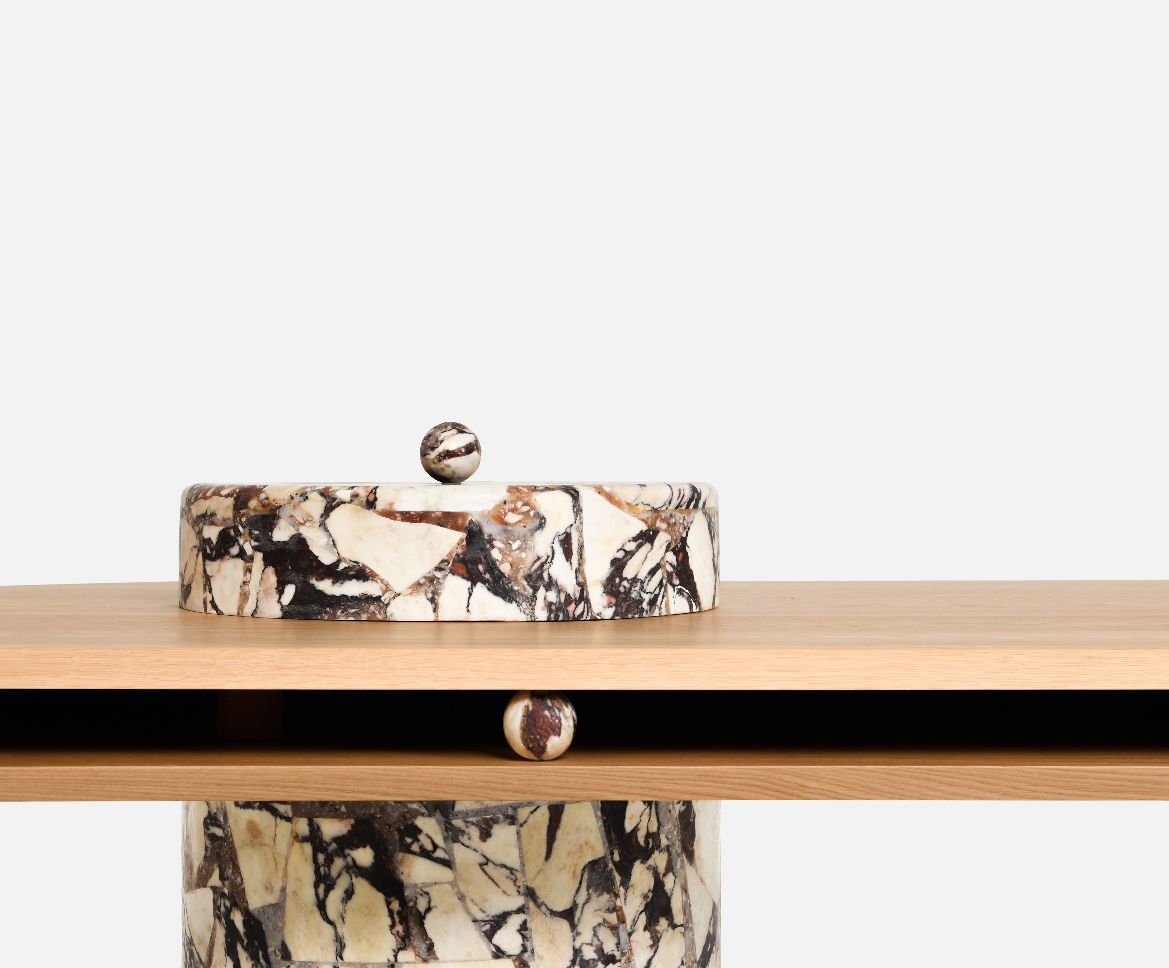 The Officium Desk, a limited edition desk, showcases a perfect balance of luxury and functionality. Crafted with Breche Violette marble and beautifully figured oak, this desk is a statement piece that elevates any workspace. Its sleek design allows for versatile placement, whether positioned in the center of a room or against a wall, seamlessly blending with modern interiors. The Officium Desk is designed to modernize the home office, offering a refined and sophisticated environment. This exceptional piece is not just a desk, but a work of art, embodying elegance and practicality in every detail.