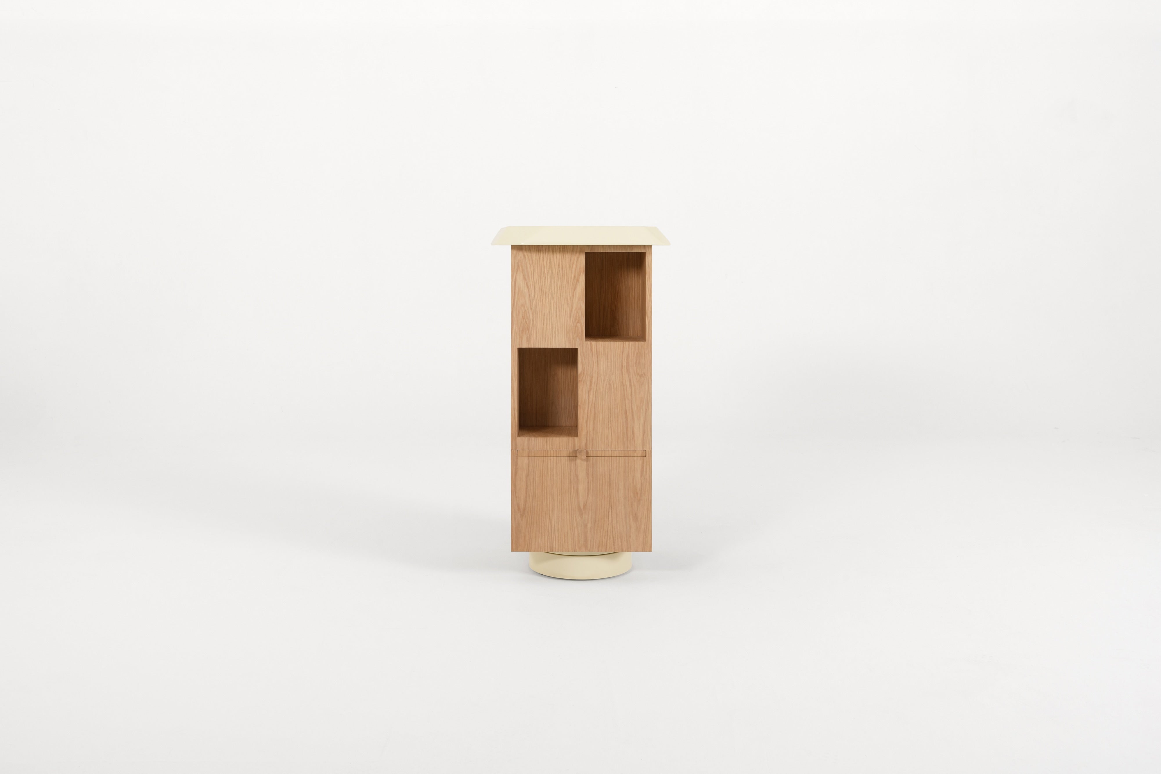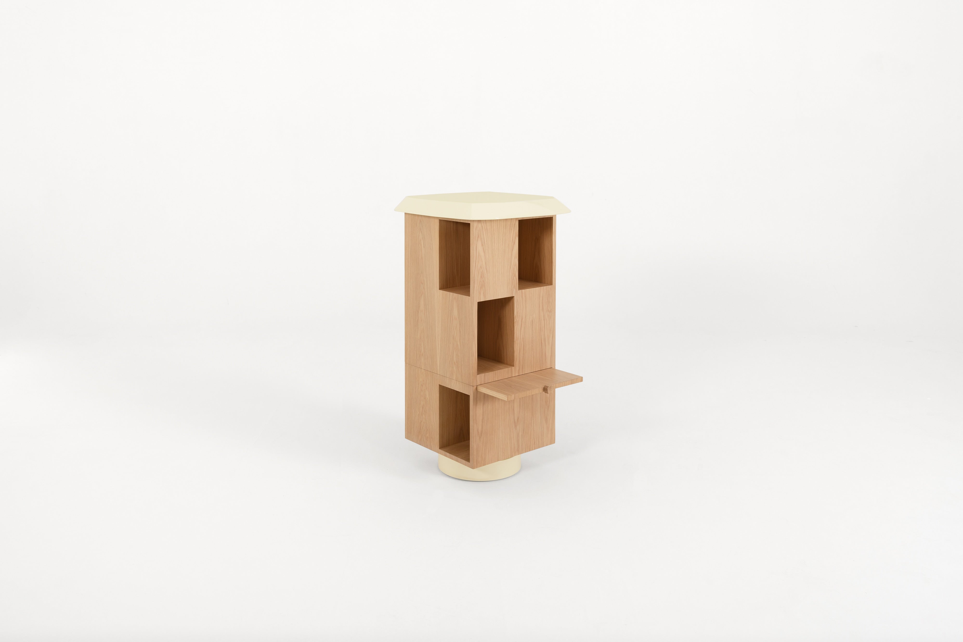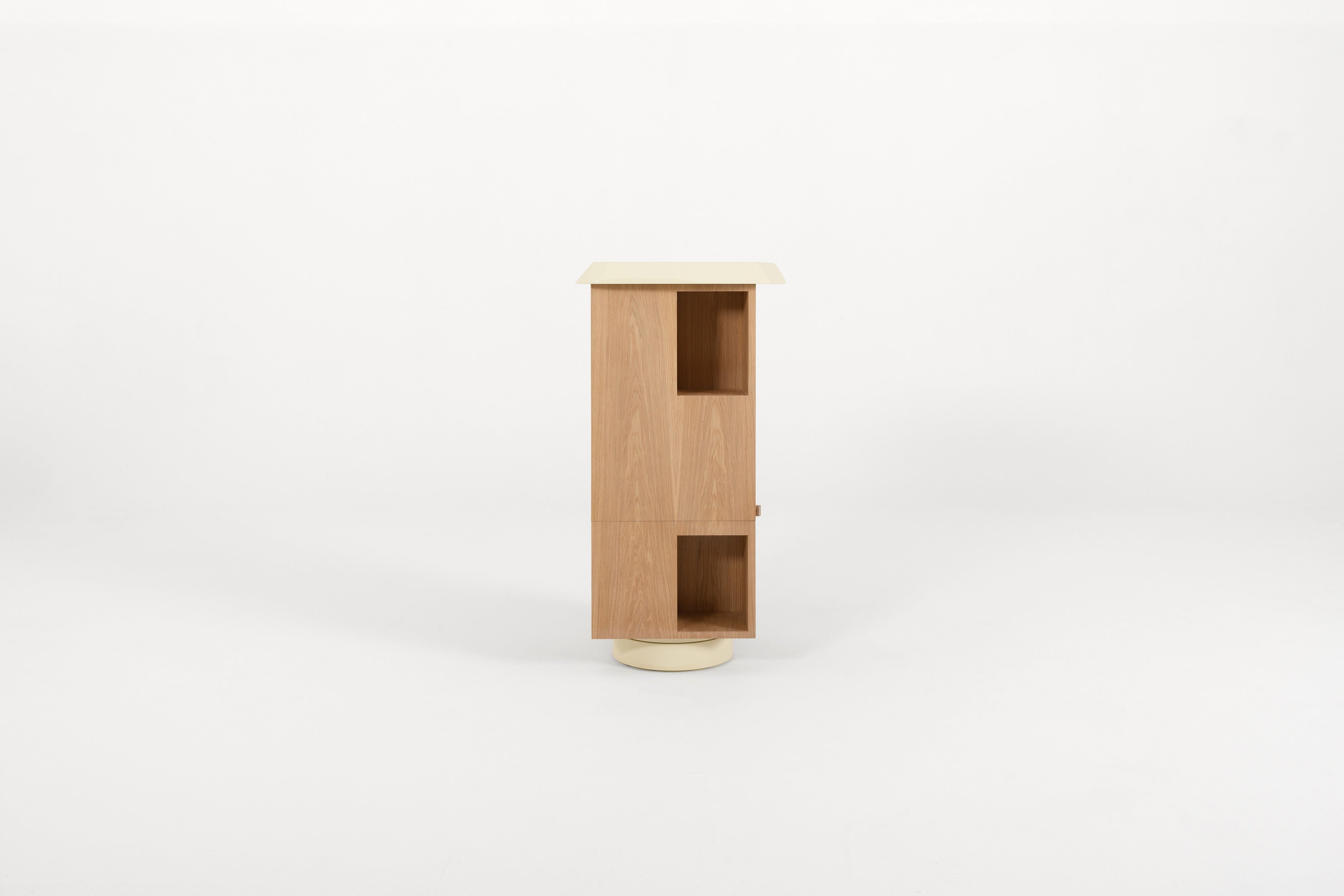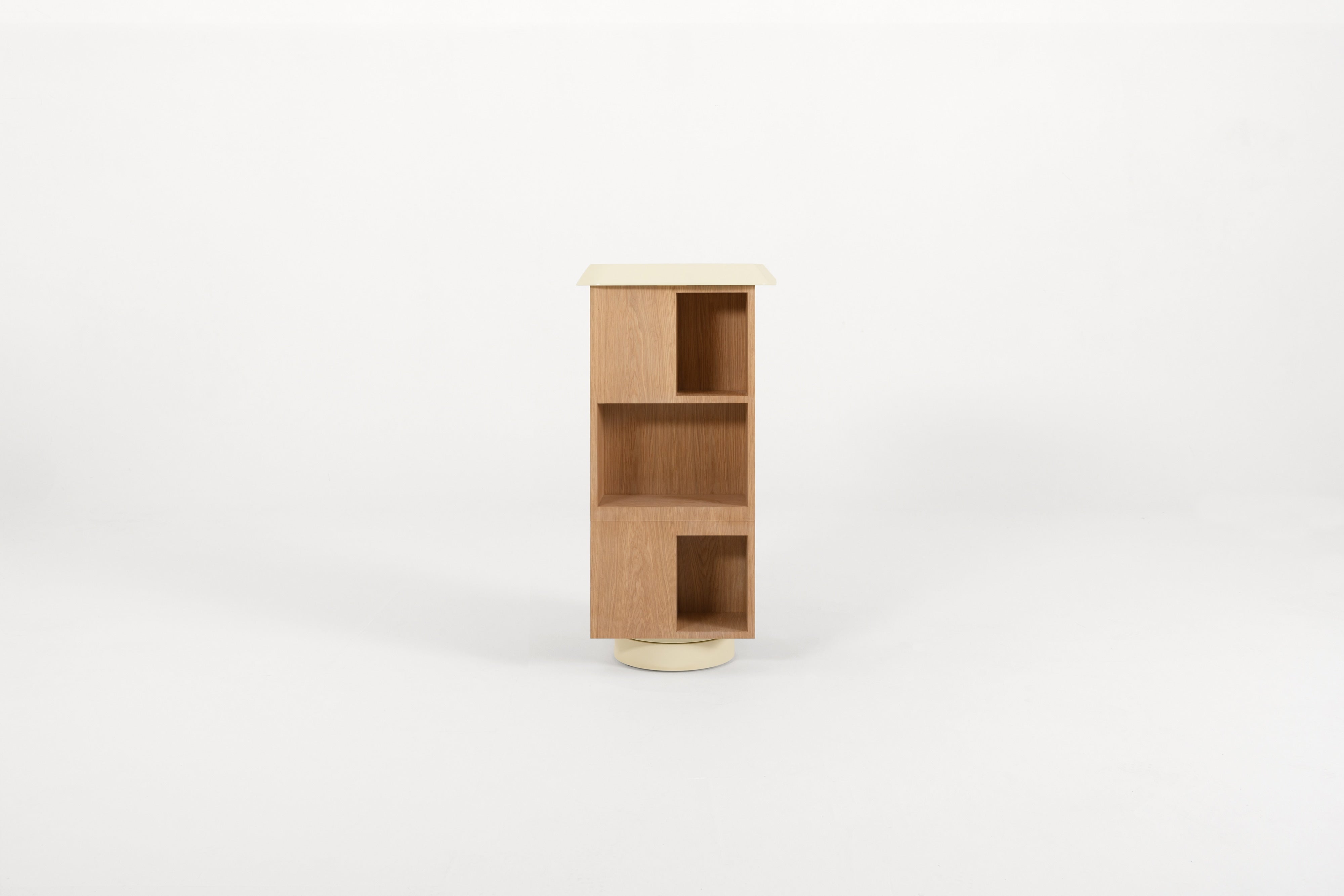 The Atlas Column is a totem bookcase that merges classic furniture design with a unique twist. Its rotating base creates a sense of movement and lightweight design, making it both functional and visually striking. With a refined lacquer finish on the top and base, and an exterior in oak veneer, this bookshelf exudes timeless sophistication. The stackable, totem-like structure adds an element of surprise, offering a balance between the familiar and the unexpected. Ideal for those seeking a distinctive storage solution, the Atlas Column is a statement piece that effortlessly blends elegance with modern versatility.