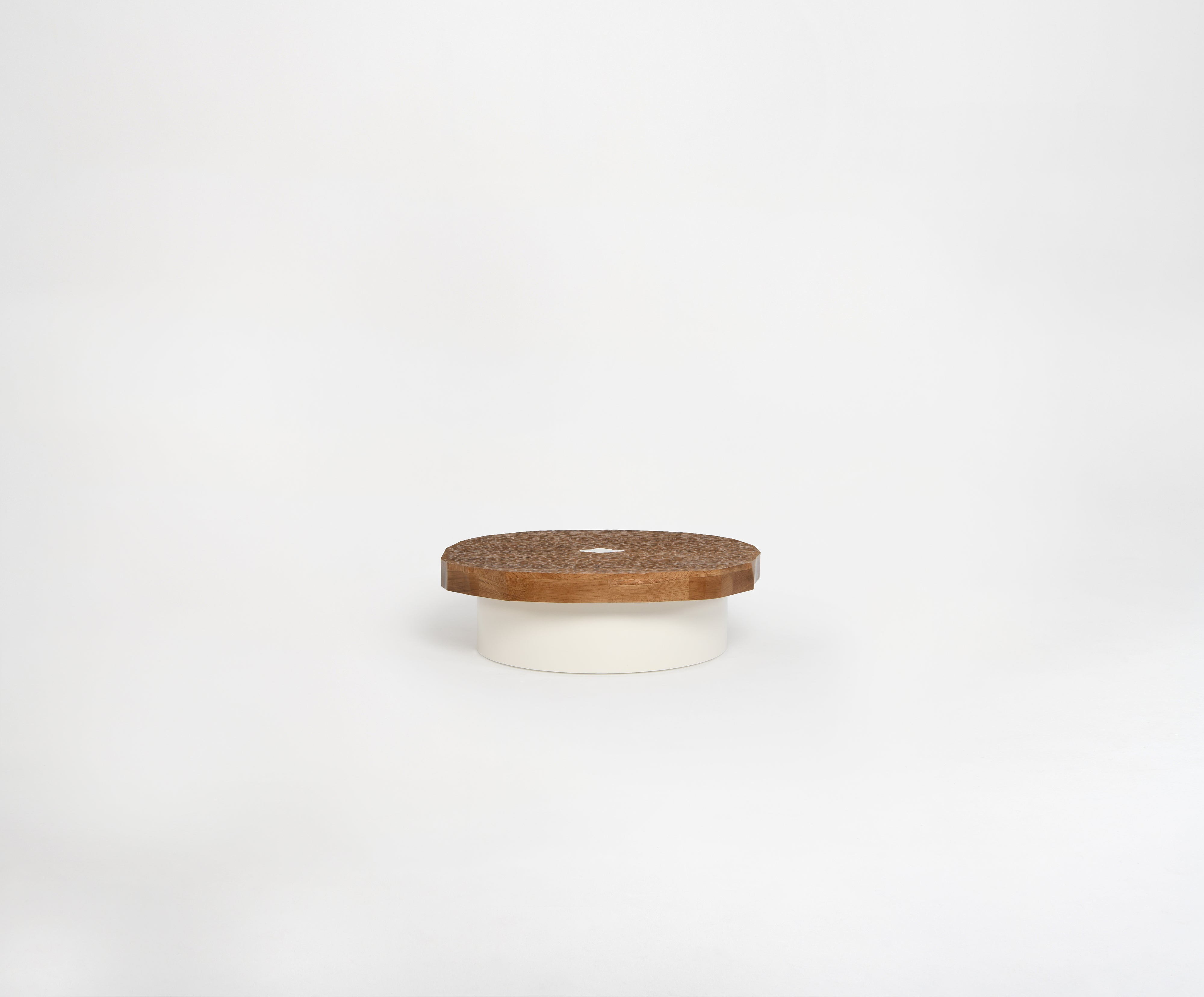 Chêne Gougé Teinté Miel Vernis Mat avec Insert, Pied(s) en Laque Brillante Blanc-Cassé