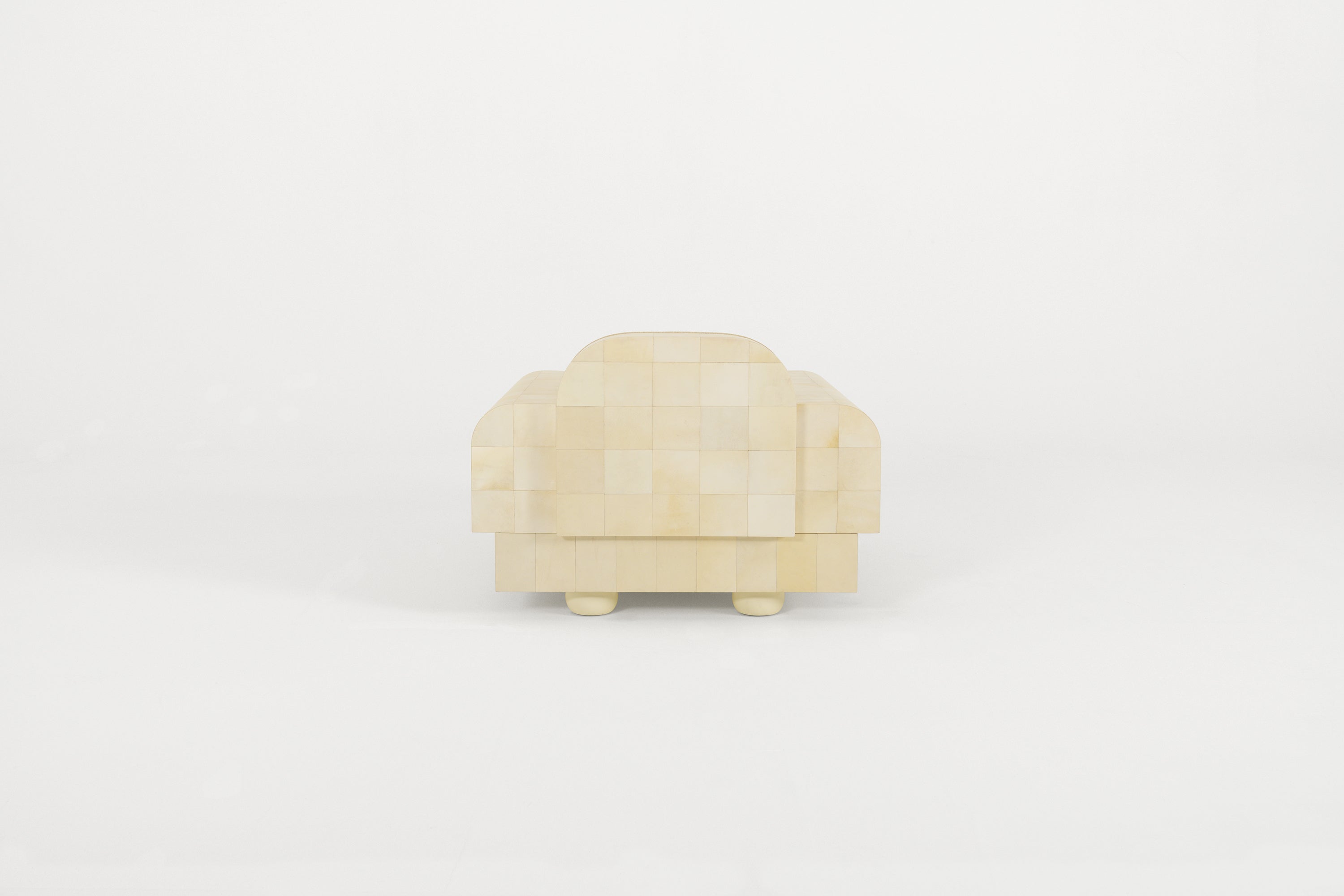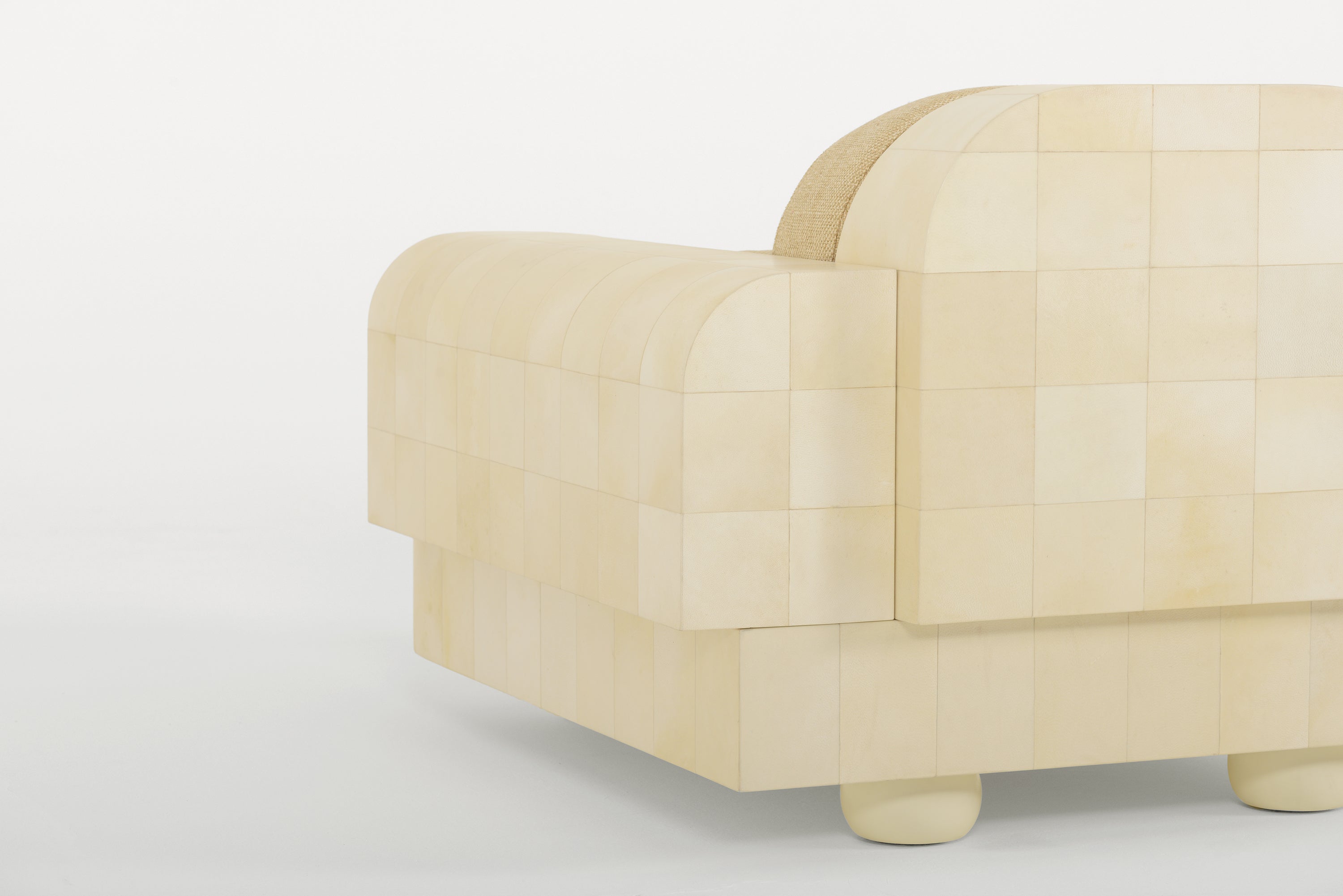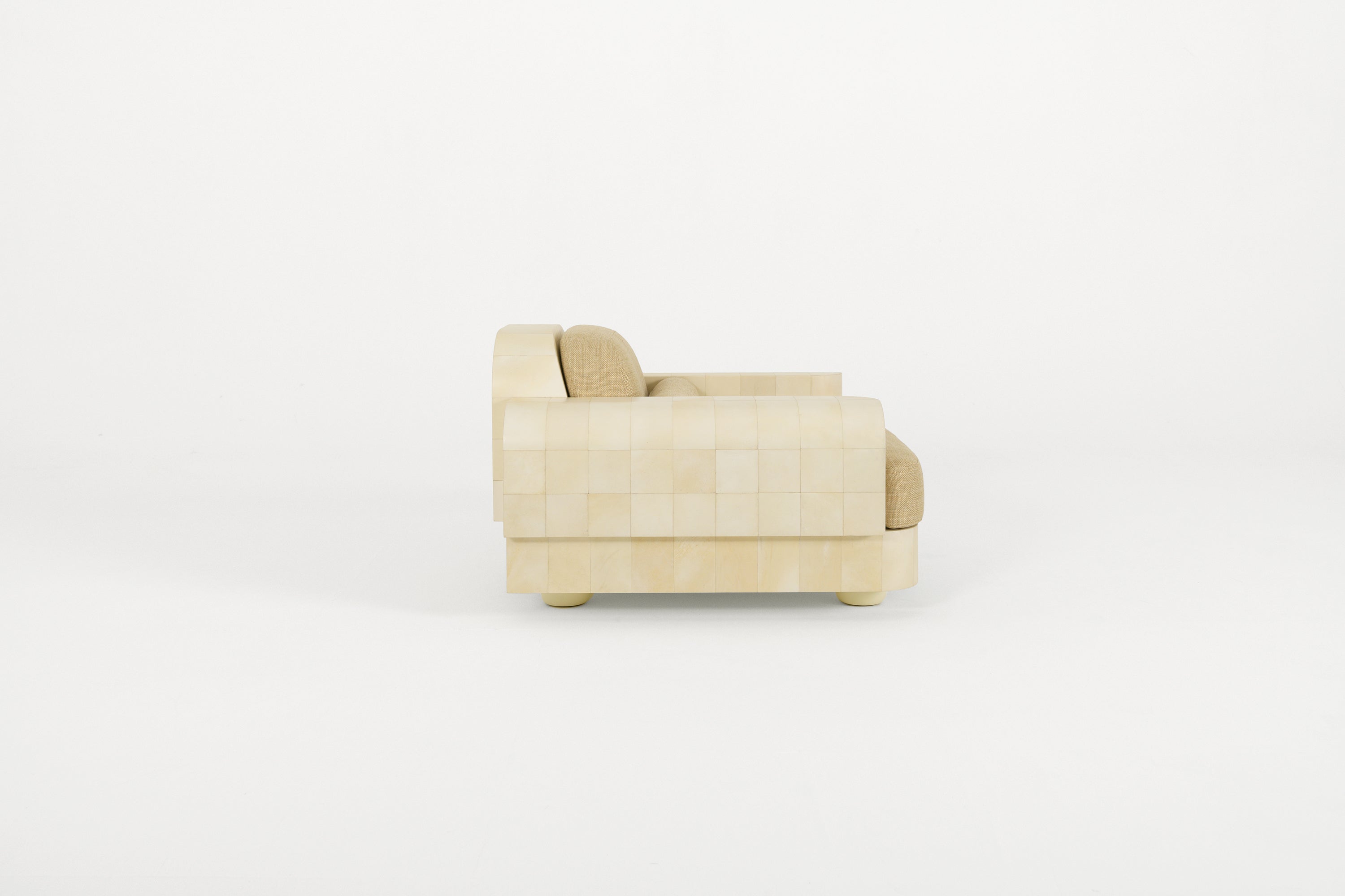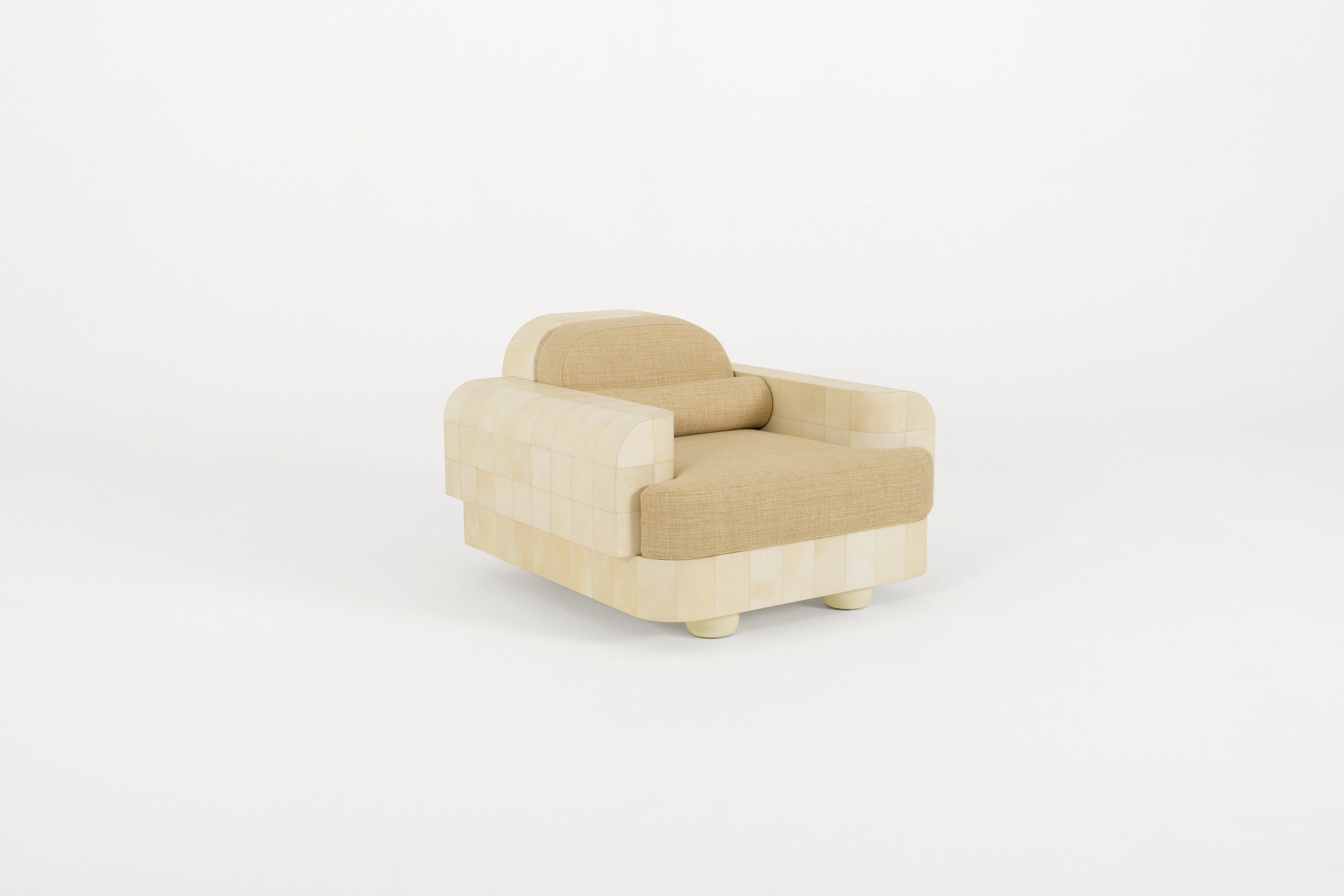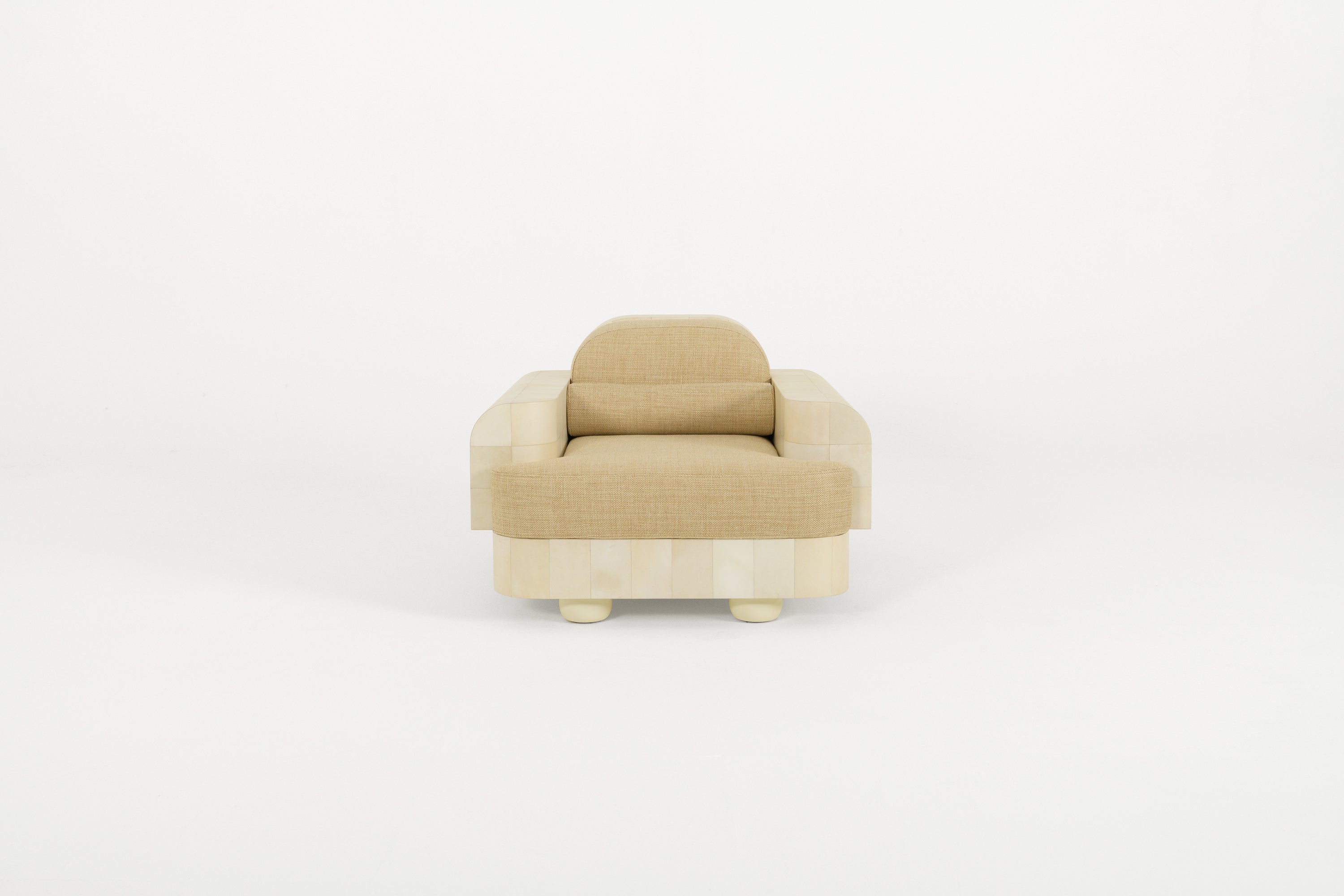 The Fumoir Parchemin seamlessly fuses Bauhaus design principles with an inviting, approachable aesthetic. Its parchment-clad wooden structure, coupled with sculptural cushions upholstered in Pierre Frey’s luxurious Angkor fabric, results in a distinctive and sophisticated armchair. The interplay of fabric and parchment creates a unique visual and tactile experience, making it a standout in both contemporary and classic interiors. This armchair offers a refined yet functional design for those who seek sophistication and comfort in a striking, Bauhaus-inspired piece.
