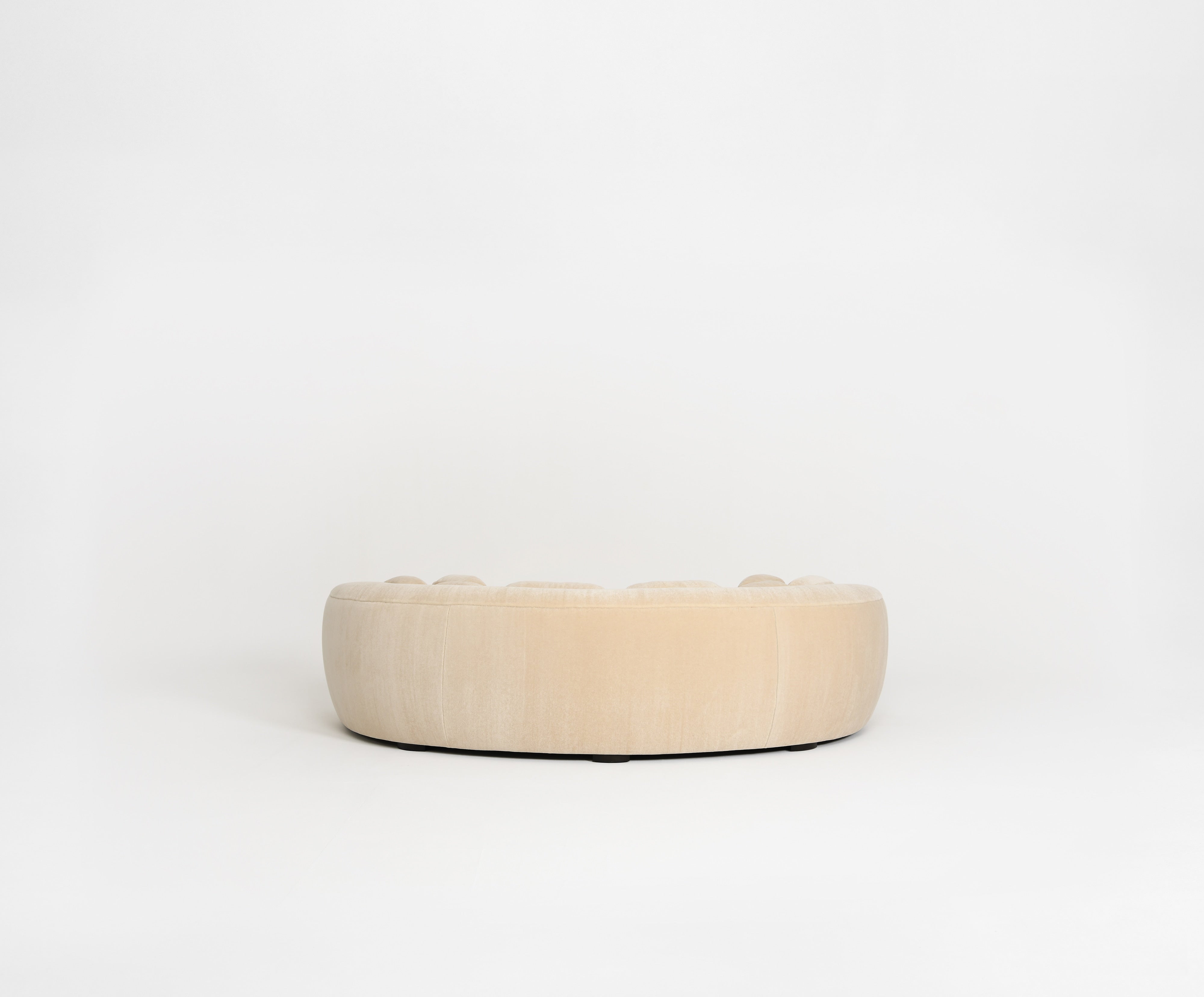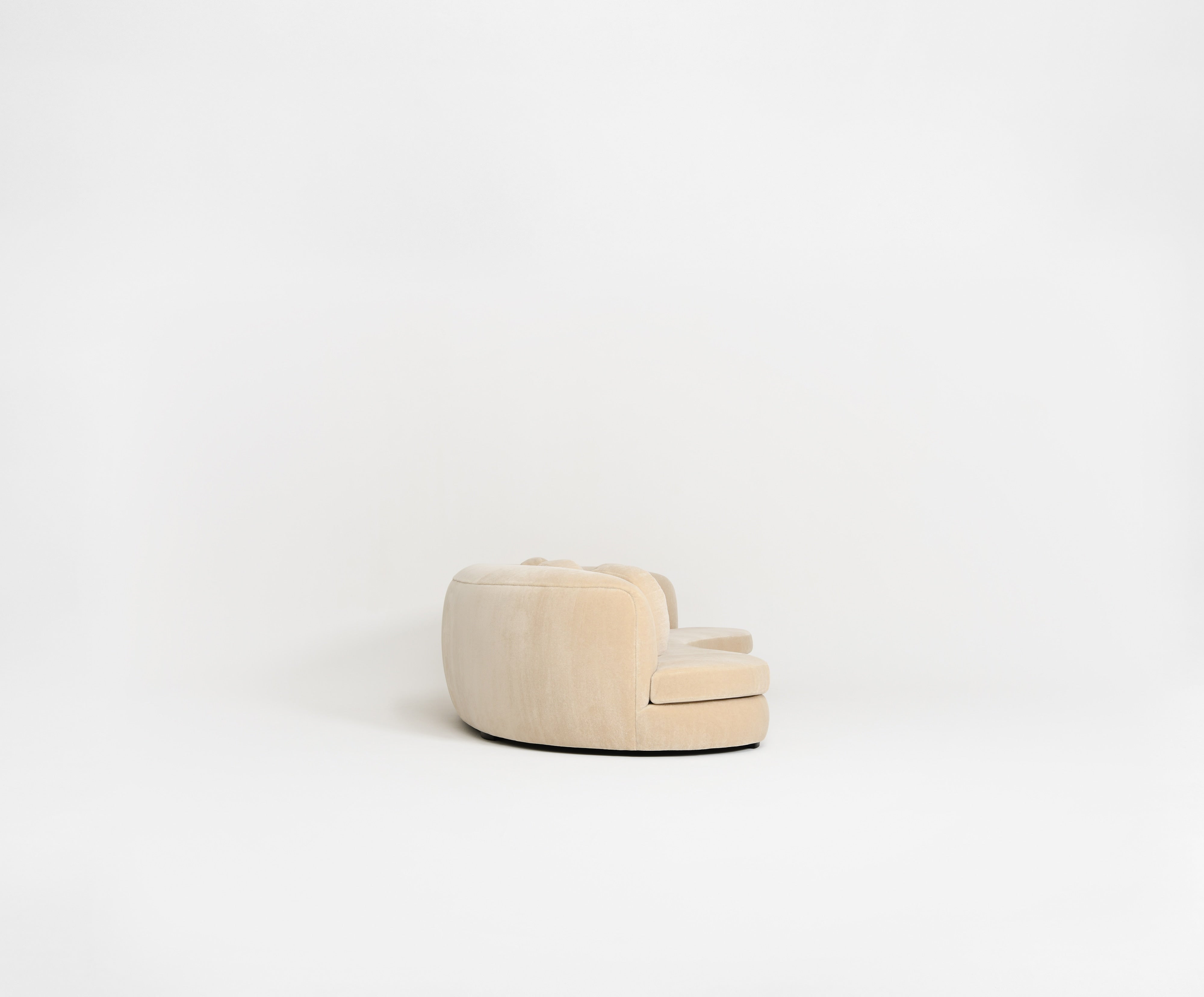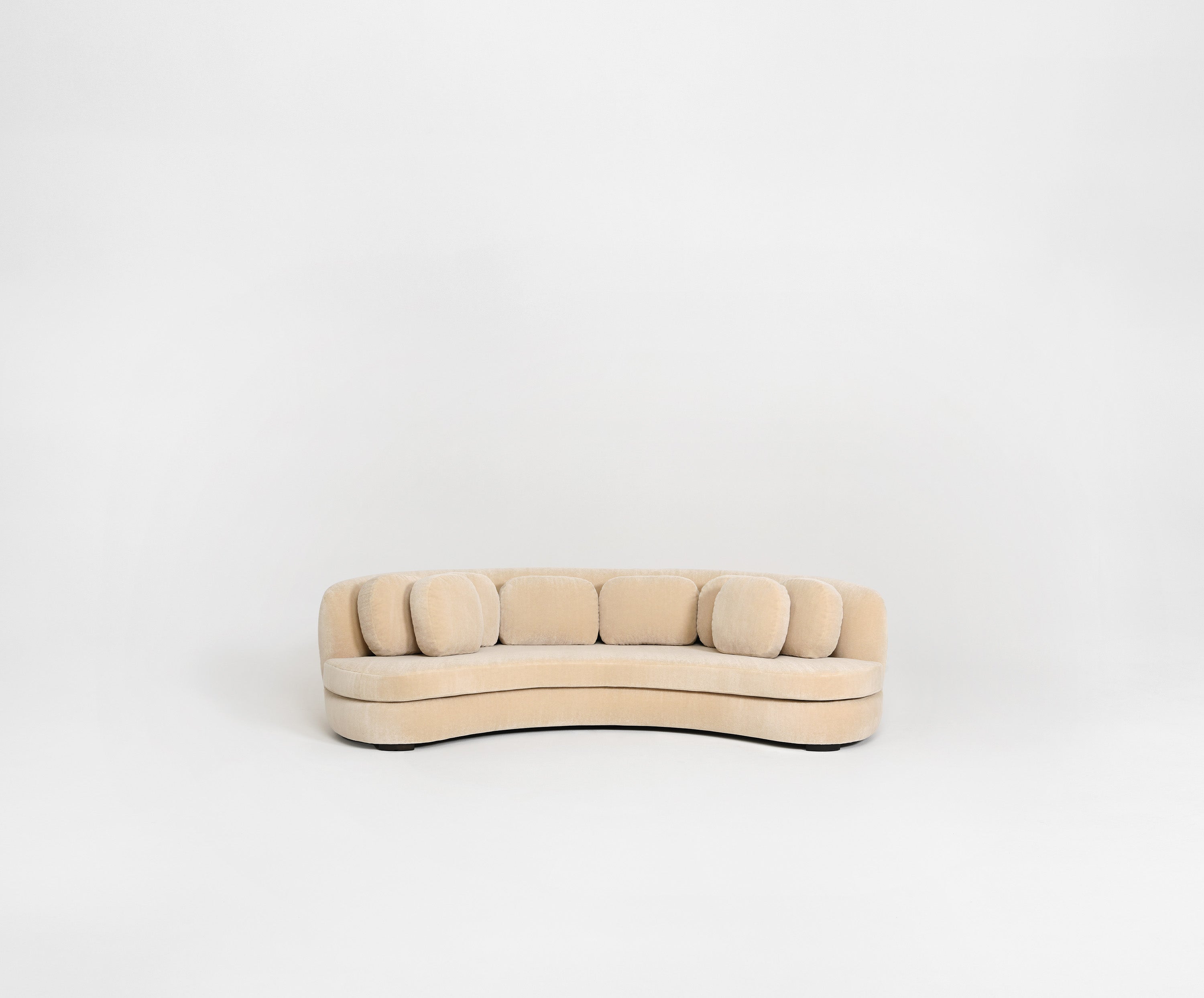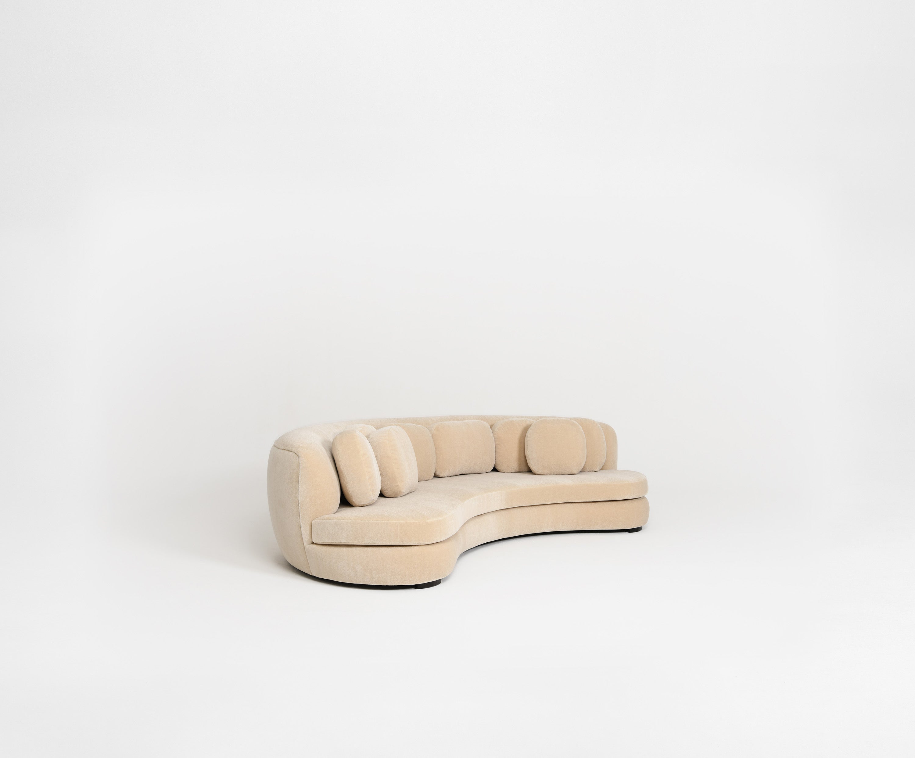 The Saint Honore Sofa combines curved lines with a deep seat, creating the perfect invitation to relax and unwind in style. Its generous depth is ideal for a siesta, while still maintaining the chic, refined essence of our collection. The legs are expertly sculpted from solid oak, adding a touch of natural elegance to the design. Upholstered in luxurious Pierre Frey fabric, this elegant sofa offers both exceptional comfort and sophistication. The Saint Honore Sofa is the perfect blend of comfort and style, making it an essential piece for those seeking a beautiful welcoming and inviting living space.